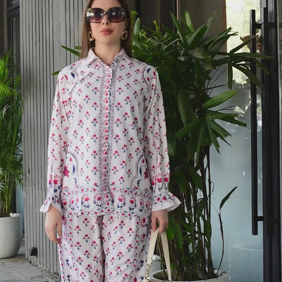 The relaxed button-down shirt with its graceful sleeves pairs perfectly with the fluid wide-leg pants — ideal for brunch dates, garden parties, or elevating your everyday elegance.
