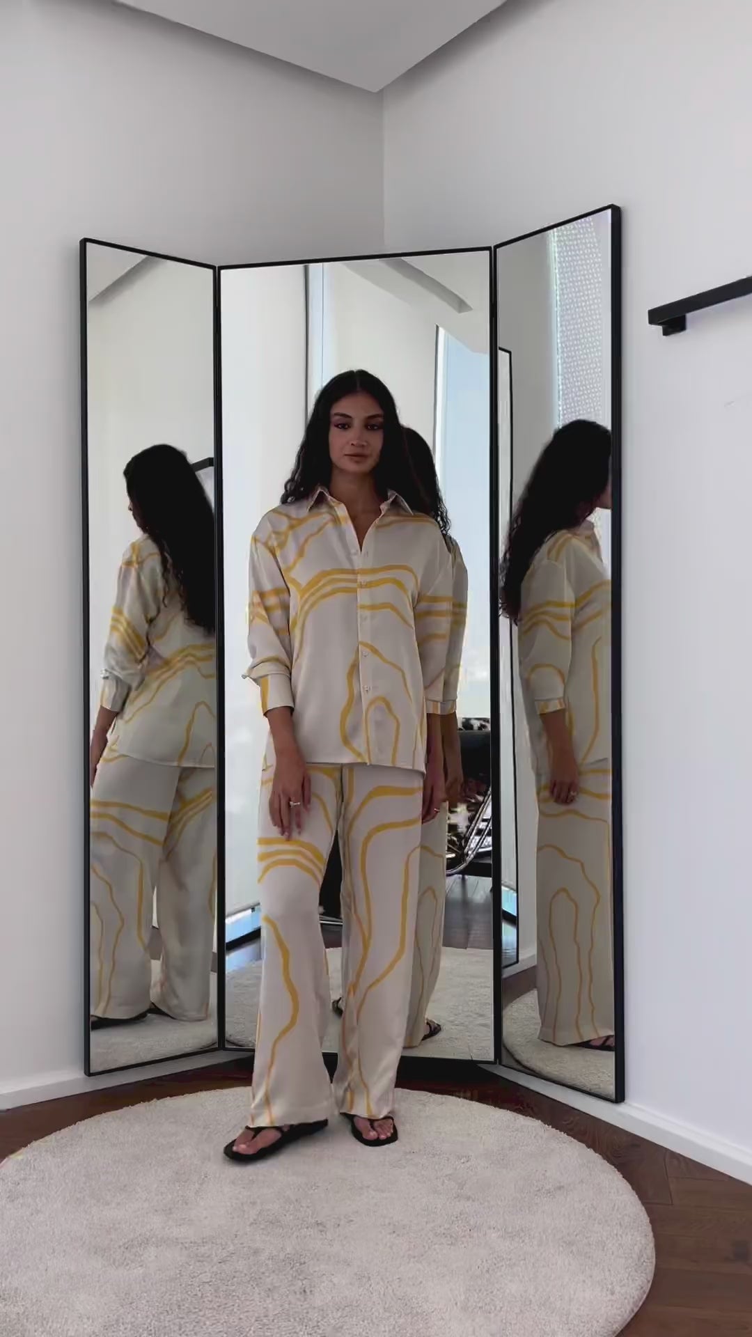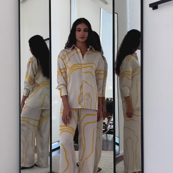 The Mirage Line Coord Set reimagines timeless stripes through a modern lens. Set against a warm beige base, the multicoloured linear flow draws the eye without overpowering — evoking the shifting calm of desert mirages and city silhouettes alike. A relaxed button-down shirt pairs effortlessly with wide-leg trousers, offering both movement and intention.